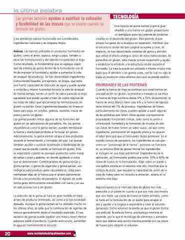 al tipo de producto terminado, así como a la funcionalidad deseada. Aunque la goma xantan se ha utilizado mucho en los últimos años, se sabe que la combinación de agentes de textura generalmente darán el resultado esperado. El uso excesivo de gomas puede agobiar una masa y tener efectos adversos sobre el producto. Cuando esto ocurre, aumentar el agua es normalmente la solución.